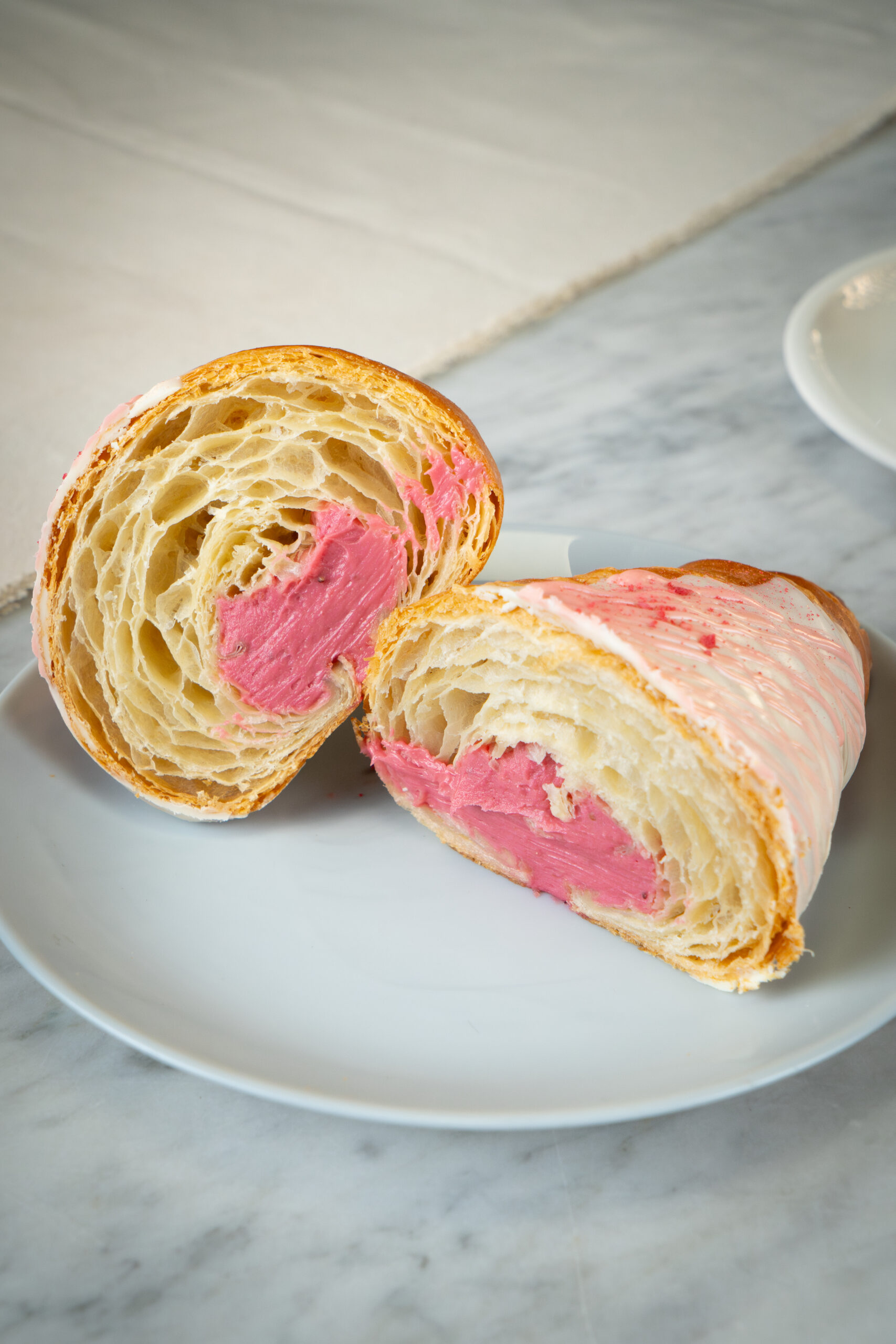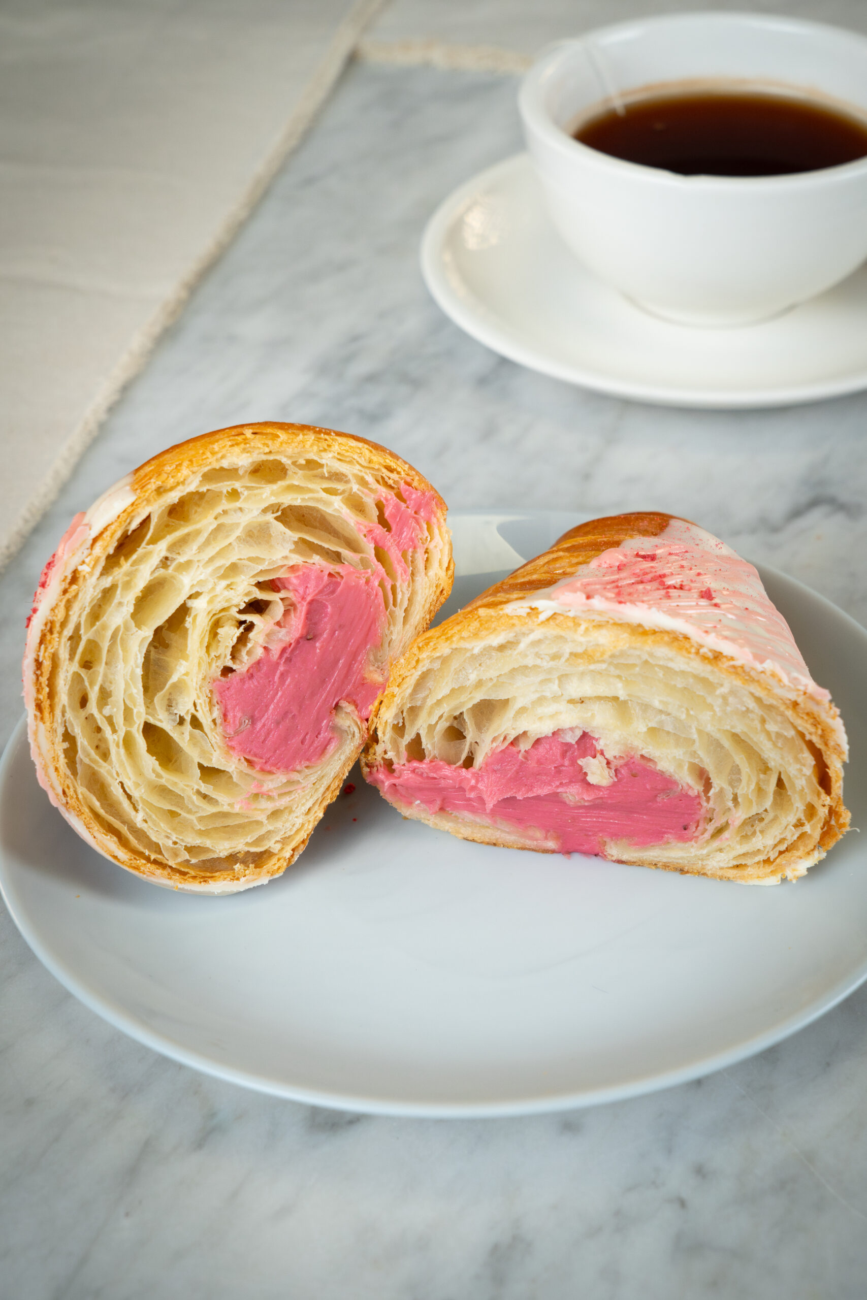 Un croissant delicado y lleno de sabor, elaborado de forma artesanal con masa hojaldrada, mantequillosa y ligeramente dulce. Su interior esconde un relleno cremoso de fresa natural que aporta frescura y una textura suave y aterciopelada.